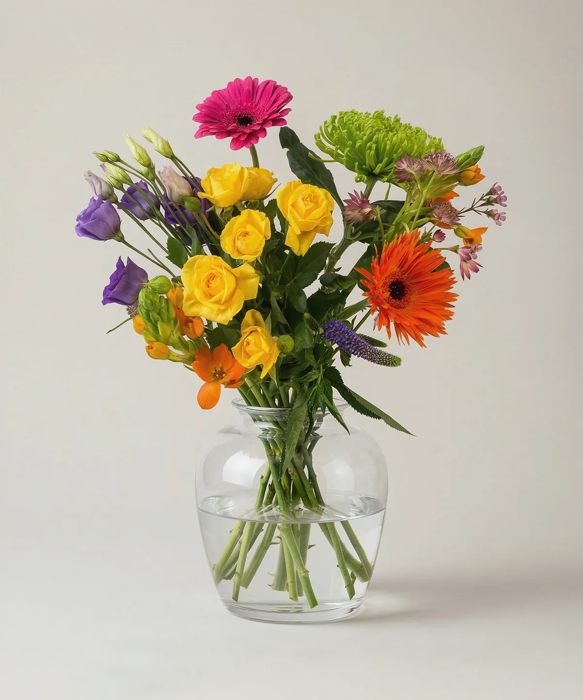 The picture is just an example. The florist chooses seasonal flowers in mixed colors and creates a bouquet in the same style and feel.