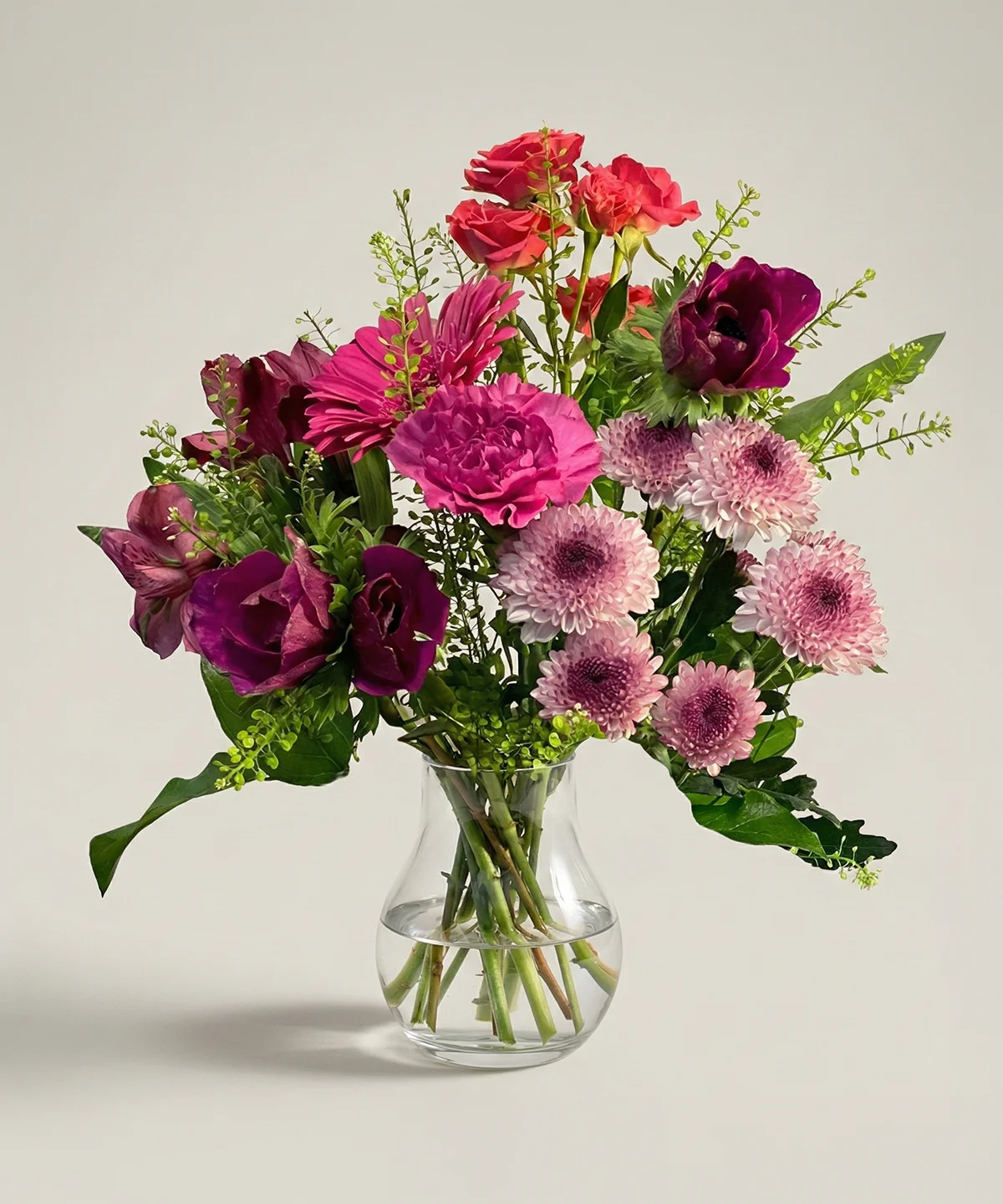 The picture is just an example. The florist chooses seasonal flowers in cerise tones and creates a bouquet in the same style and feel.